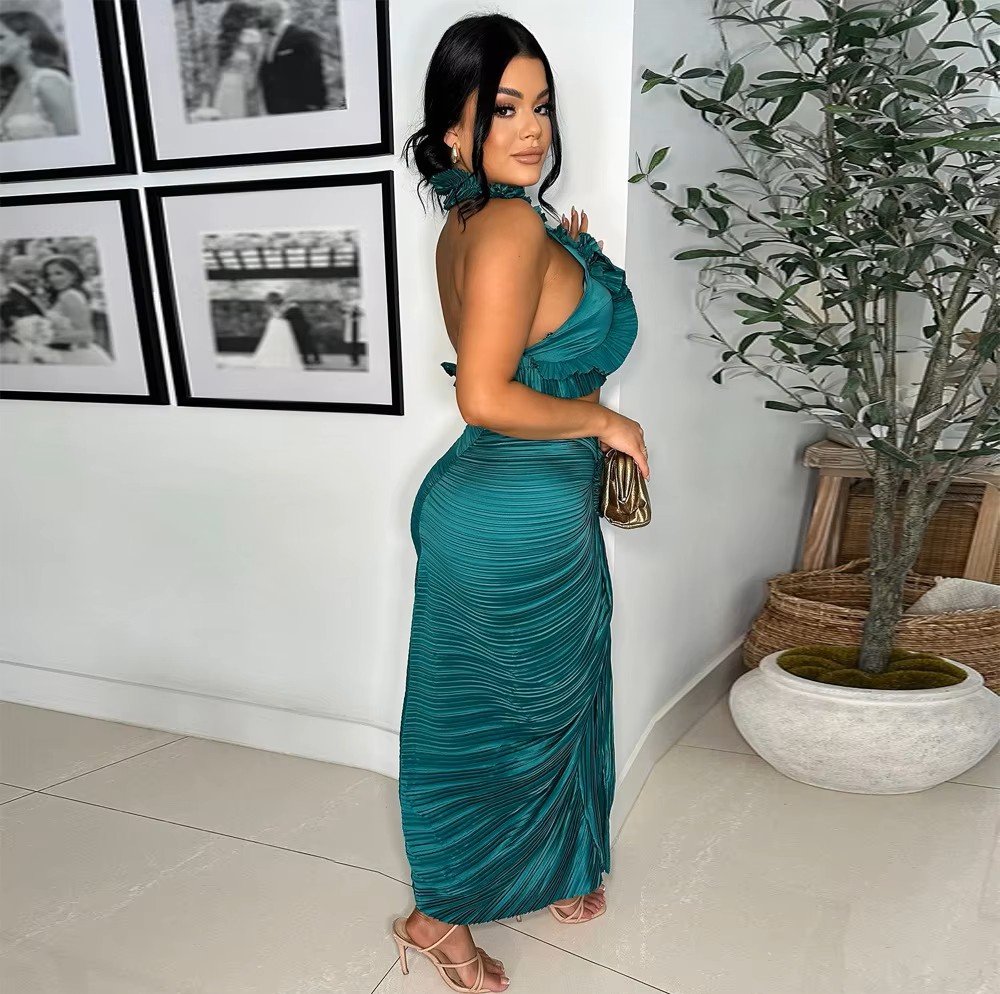 Ruffles Crop Top and Ruched Split Skirt Set